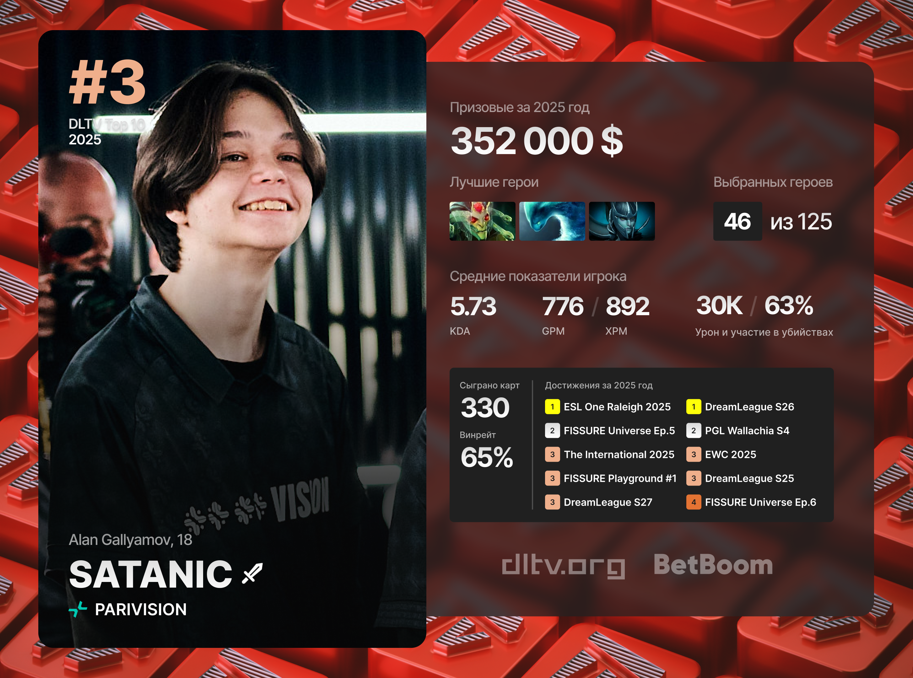 สามอันดับแรกของผู้เล่นที่ดีที่สุดประจำปี 2025 ตามการจัดอันดับของ DLTV.ORG เปิดด้วยแครี่จาก PARIVISION คือ Satanic เขาติดอันดับผู้เล่นยอดเยี่ยมของ DLTV.ORG เป็นครั้งแรก และเป็นเจ้าของเหรียญทองแดงที่อายุน้อยที่สุด ทั้งนี้ ในปี 2025 Satanic ยังคว้ารางวัล '30 до 30' ในสาขากีฬาและอีสปอร์ตตามการจัดอันดับของ Forbes