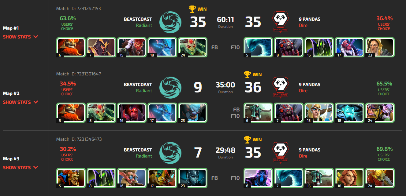 На второй карте “панды” взяли практически всех своих сигнатурных героев и уничтожили своего оппонента уже на стадии лайнинга. Отличная игра от всей пятерки игроков, позволила легко сравнять счет в серии. На третьей карте 9 Pandas снова победили без проблем, взяв для себя комфортных героев. Kiyotaka сыграл на Windranger - это был хороший выбор против вражеского керри. Parker на Phantom Assasin плохо отстоял линию из-за чего шансов на камбек у Beastcoast не было. Kiyotaka делал убийства по всей карте и закончил со статистикой 15/3/6. 9 Pandas побеждают со счетом 2:1. Beastcoast покидают турнир.
