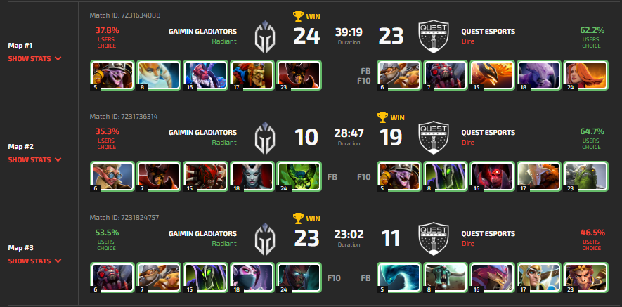 The second game was another outdraft in the opposite direction. The laning phase was even for both teams, but once No!ob's Tiny got his Blink Dagger, Quest Esports started to pick up the pace and deny the entire map for the Gladiators. It was impossible for Gaimin to take a fight, as Quest heroes were always healthy thanks to TA2000's Healing Ward. GG was called at 28 minutes, and the series was tied.