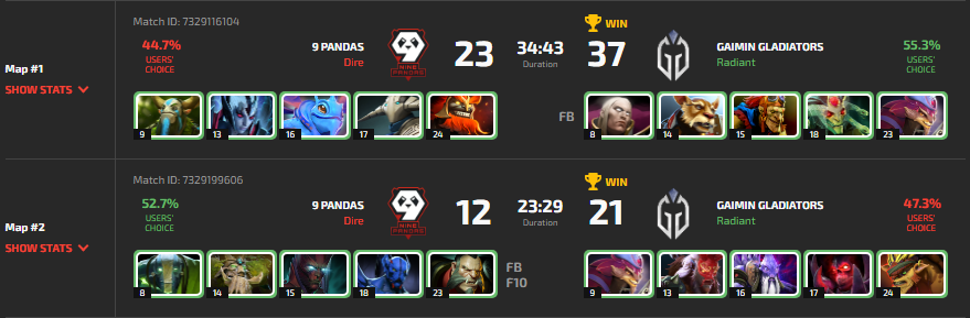 Game 2 was a weird one. 9 Pandas picked Terrorblade on 15th pick, but it was countered heavily by Dark Seer and Shadow Demon on the 17th and 18th pick for the Gladiators. As a result, 9 Pandas drafted Night Stalker for RAMZES, and put Antares on Terrorblade as position four. This draft adjustment did not work out, and the Gladiators could stomp the game in 23 minutes.