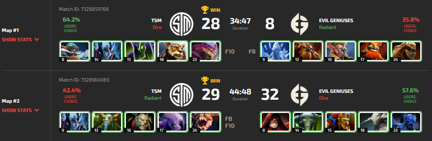The game looked good for the Evil Geniuses, as they amassed a 30,000 net worth lead at 40 minutes. However, they made the mistake of giving TSM free access to Roshan. Using the Aegis advantage, TSM took a fight at EG's Triangle and won it after EG failed to burst Timado. TSM converted the team fight victory to get Mega Creeps and ended the game shortly after. A massive comeback from the North American roster to win the series 2-0.