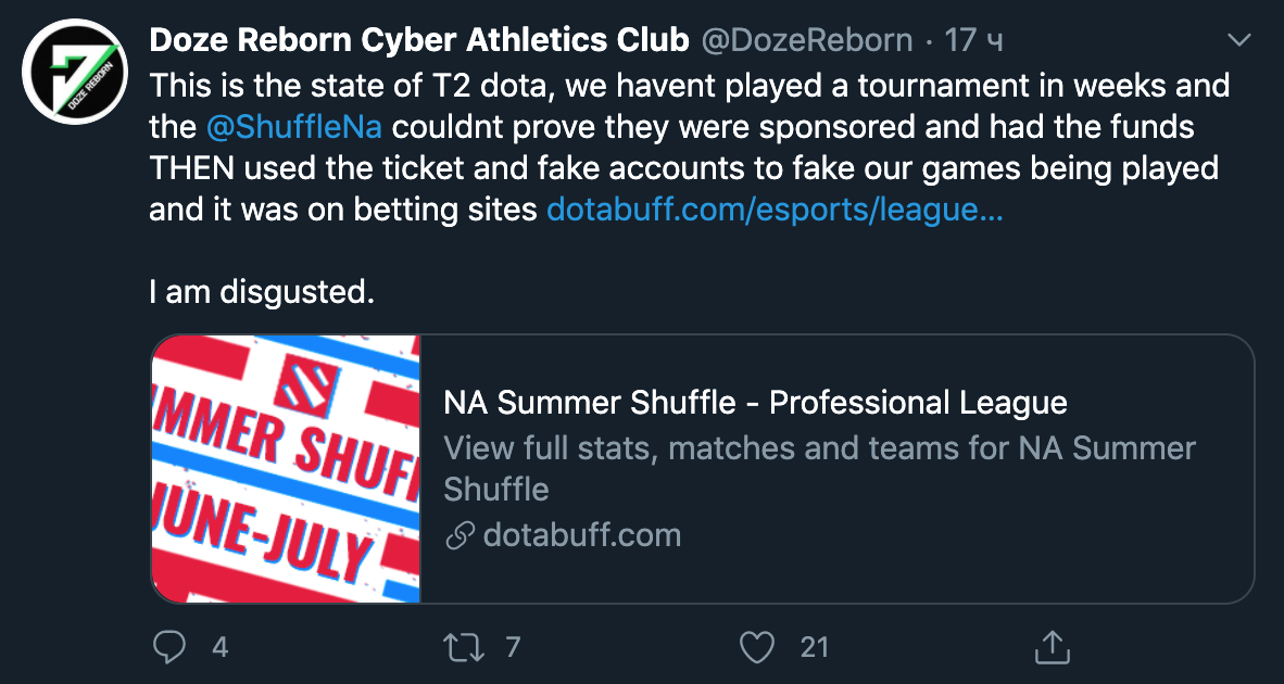 Букмекерские конторы начали добавлять турнир к себе на сайты и открыли прием ставок. NA Summer Shuffle стартовал по расписанию, но после первого же матча между Doze Esports и Reborn со стороны Doze Esports публикуется твит: