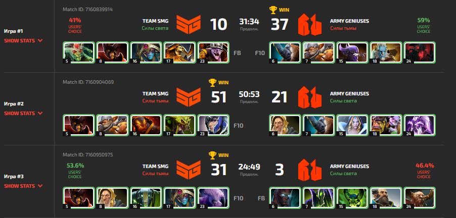 В решающем противостоянии Army Geniuses плохо провели стадию лайнинга: на 20 минуте они проигрывали уже 15,000 золота. Вернуться в игру уже было сложно и SMG заслуженно забирают победу.