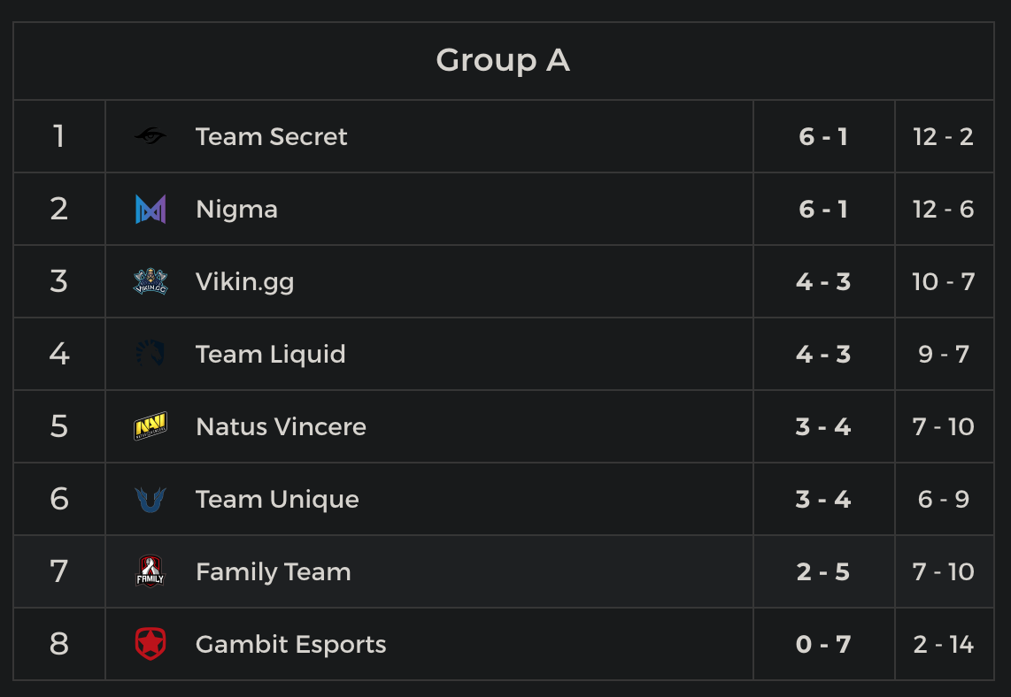 Team ??Secret and ??Nigma went to the upper bracket. Two more teams, ??Vikin.gg and ??Team Liquid, will start their performance in the lower bracket. According to the results of the group stage, ??Natus Vincere, ??Gambit, ??Team Unique, and ??Family Team leave the tournament.