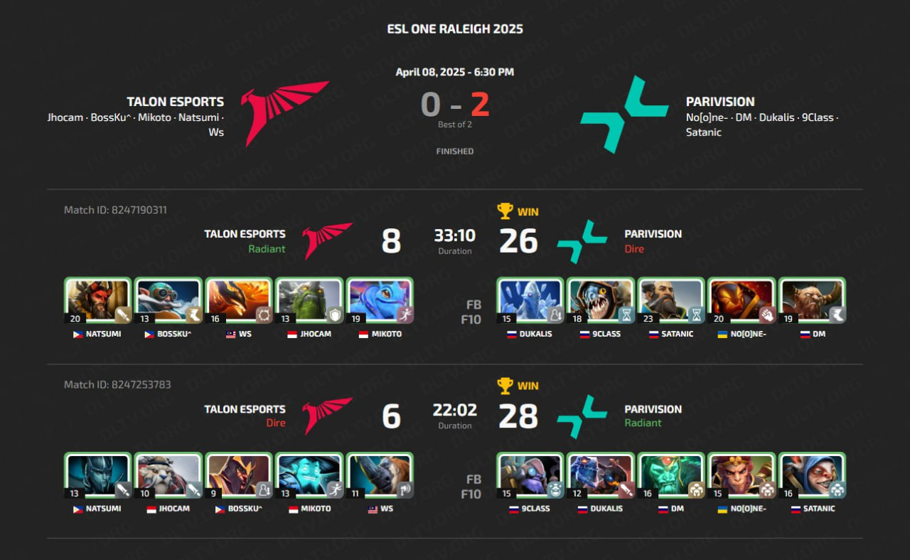 Второй день групповой стадии ESL One Raleigh 2025 завершился. Talon Esports и Shopify Rebellion оказались худшими коллективами группы А, разделив очки лишь в очном противостоянии. PARIVISION, Team Spirit, Nigma Galaxy и Team Liquid сыграют за посев в Плей-офф.