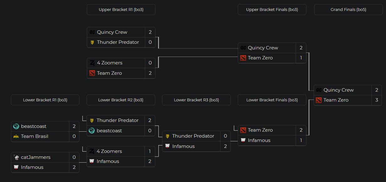 До матча ??Team Zero считались аутсайдерами. Букмекеры давали коэффициент 6 на их победу, но финальная встреча удивила многих. ??Team Zero смогли выиграть матч со счетом 3:2.