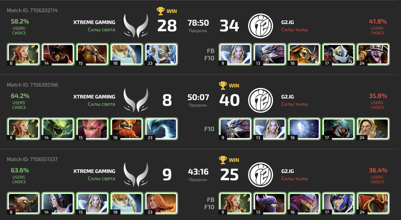 В результате Xtreme Gaming отыграли 12 тысяч перевеса и заявили, что какой бы ни была игра, они не готовы сдаваться. Через несколько минут коллектив XinQ снова провел выгодный тимфайт, выбив три байбека у G2.iG. После этих двух файтов и до конца игры G2.iG удалось сделать только два убийства. Медленно, но верно Xtreme Gaming закончили эту карту в свою пользу. Несомненно именно Xm стал MVP этой игры, он поучаствовал в 93% убийств за 79 минут и нанес 100 тысяч урона, больше чем кто-либо. В свою очередь NothingToSay на мидовом Slardar нанес только 30 тысяч.