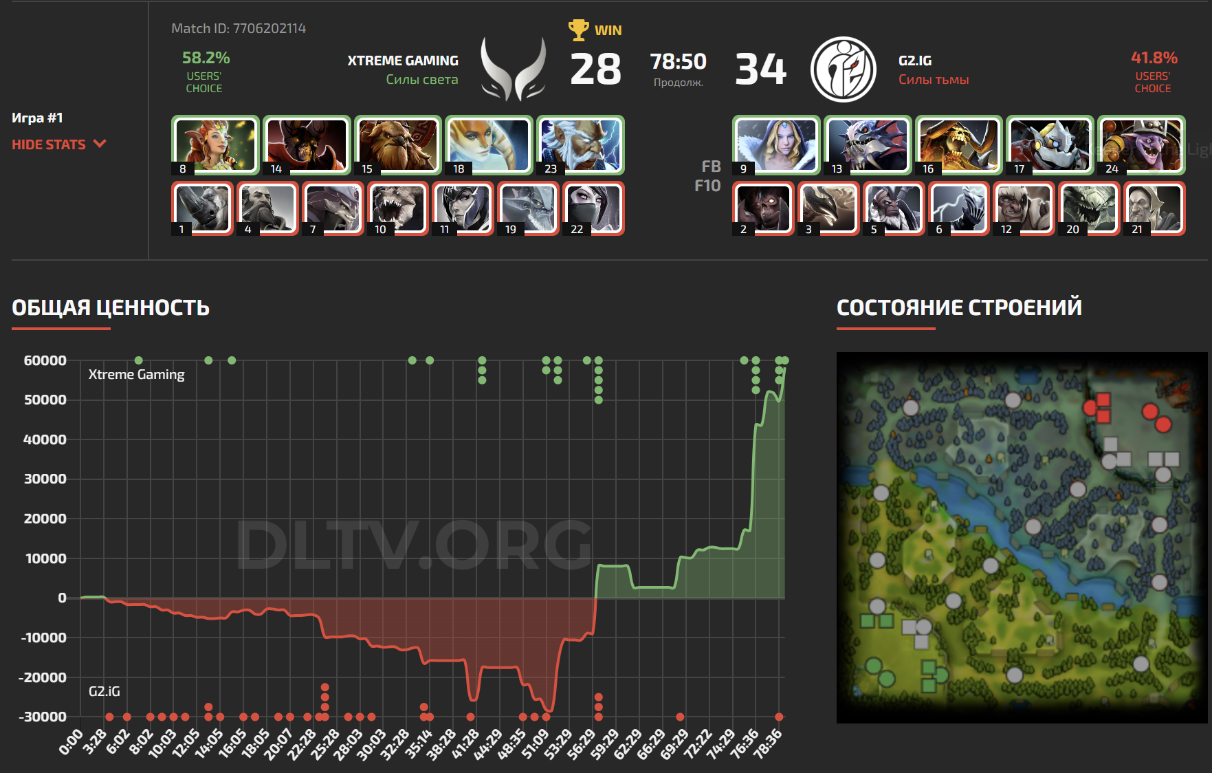 Первая карта подарила нам невероятный камбек от Xtreme Gaming. G2.iG доминировали на протяжении почти всей игры с большим перевесом по золоту и счету. Их оппонент Xtreme Gaming к 35 минуте заработал всего пять фрагов. Имея в своем распоряжении Zeus и Naga Siren, Xtreme Gaming успешно защищали свою базу и затягивали эту игру. При очередном заходе G2.iG на хайграунд на 51 минуте произошел файт, который изменил исход этой карты. Несколько ошибок от атакующих и хороший ульт Naga Siren завершили драку в пользу Xtreme Gaming, даже с учетом байбека Ame.