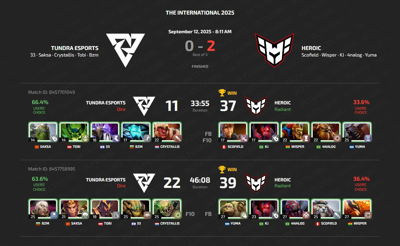 ทั้งสองแผนที่เป็นเรื่องง่ายสำหรับ Heroic และ Crystallis กลายเป็นคนแรกที่แพ้ใน Troll Warlord ใน The International 2025 ก่อนหน้านี้ฮีโร่ชนะ 10 แผนที่จาก 10 แผนที่ จำได้ว่า Tundra Esports มาที่ The International 2025 พร้อมกับการเปลี่ยนแปลง ผู้สนับสนุนของทีม - Whitemon ไม่สามารถได้รับวีซ่า แทนที่เขาในตำแหน่งที่ห้าได้ Tobi