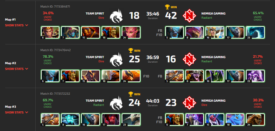 Though behind, Spirit punched back multiple times to keep the game winnable. At the 30 minute mark, a massive team fight broke out at the bottom Roshan area, where Nemiga came out victorious, allowing them to upset Spirit and win Game 1 of the series.