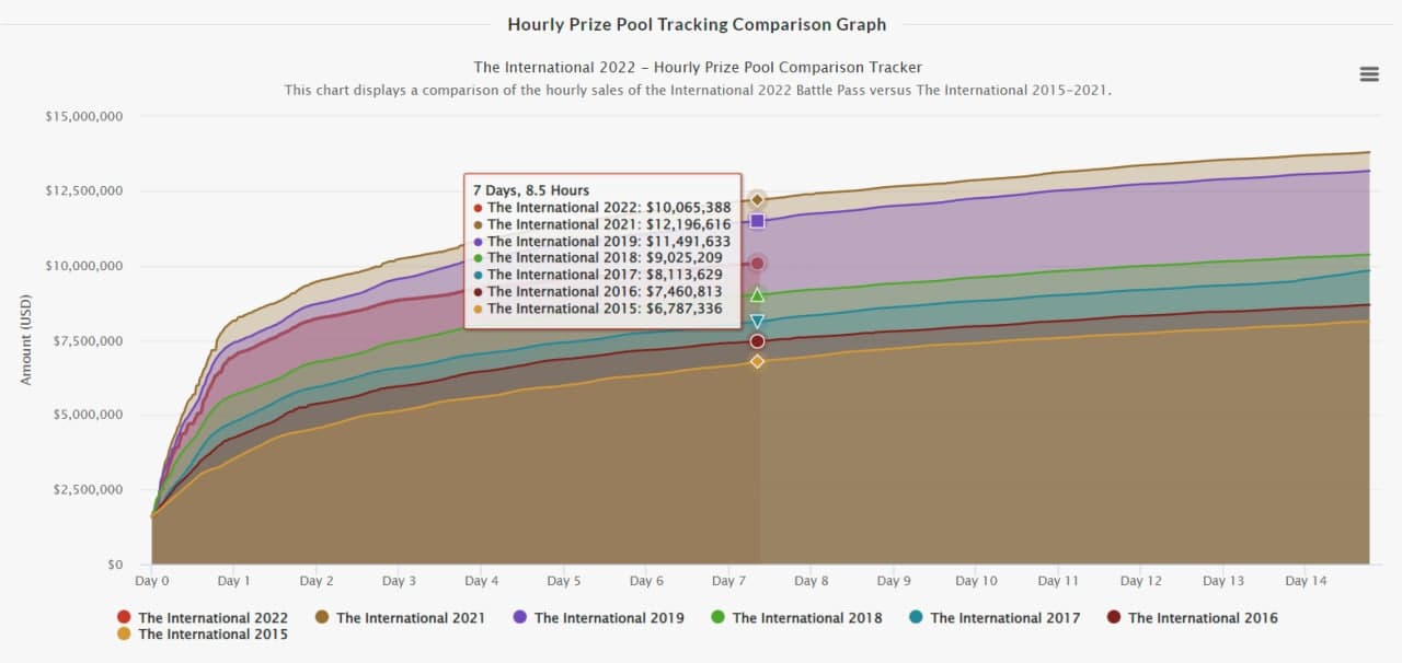 Согласно данным сайта Dota 2 Prize Pool Tracker, текущий The International уступает двум предыдущим турнирам серии по темпу роста призового фонда. К этому моменту The International 2019 уже собрал $11,4 млн, а The International 2021 — $12,1 млн.