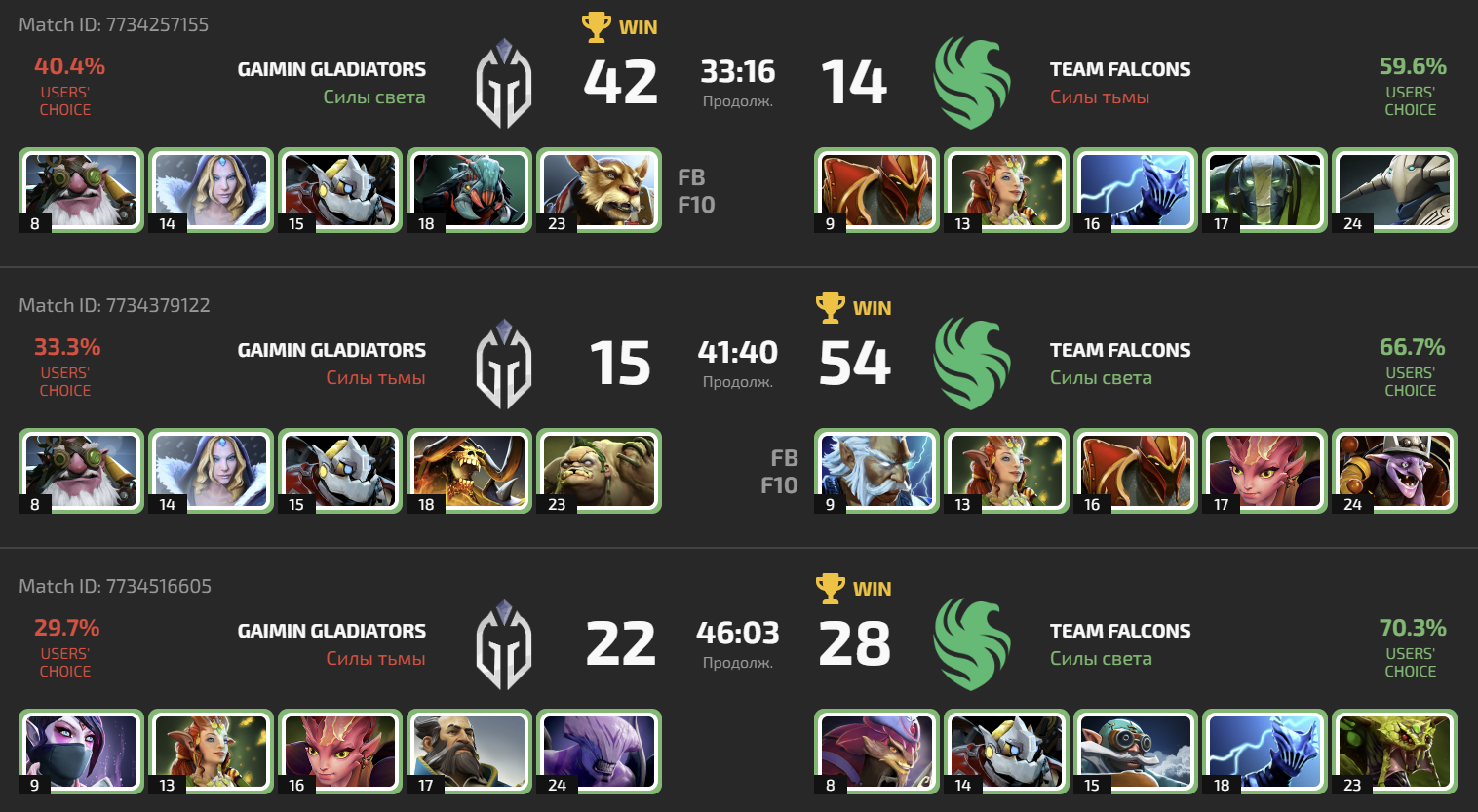 В решающей карте у Gaimin Gladiators был хороший перевес по золоту, но это не отображало реальной ситуации в игре. Команды не проводили тимфайтов пять на пять, а лишь цепляли врагов по одиночке. Хоть драфт у Gaimin Gladiators и был нацелен на лейт, Team Falcons провели прекрасный файт, продержав dyrachyo в контроле.