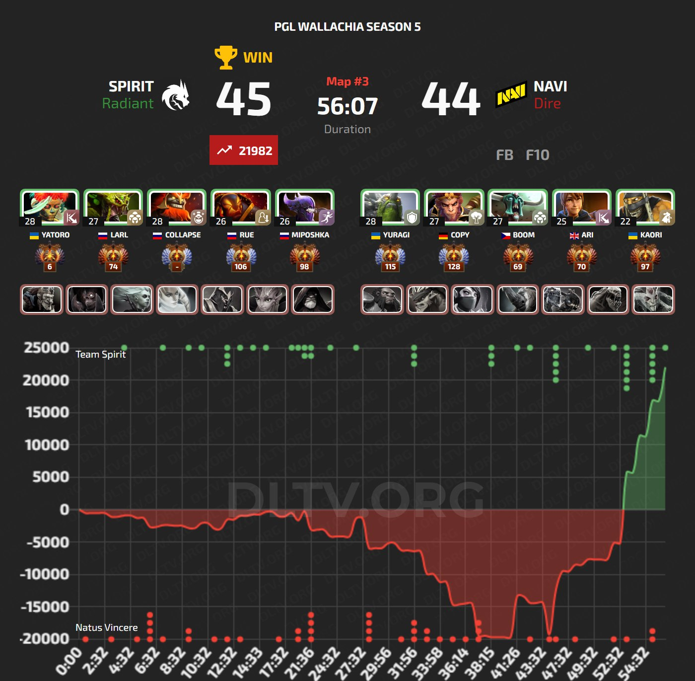 Yatoro ใช้ Muerta เก็บ Divine Rapier และป้องกัน Natus Vincere ไม่ให้เข้ามาในฐานของเขา หลังจากการต่อสู้ทีมที่ประสบความสำเร็จหลายครั้ง Team Spirit ในรูปแบบที่เป็นเอกลักษณ์ของพวกเขา ได้ทำการกลับมาอย่างบ้าคลั่งจากการขาดดุลที่เกือบจะเป็นไปไม่ได้และผ่านเข้ารอบ Playoffs