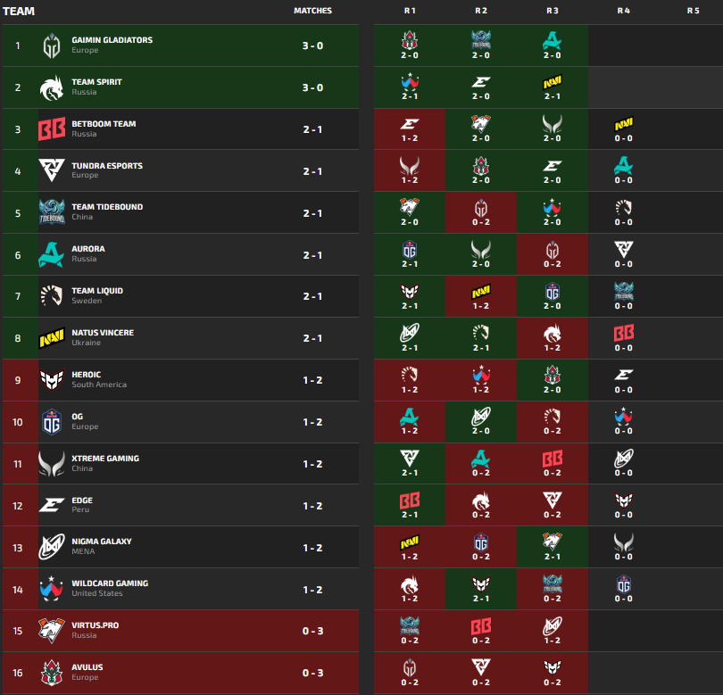 Gaimin Gladiators เข้าร่วมกับ Team Spirit ในรอบ Playoffs หลังจากชนะ Aurora 2-0 ทีมจากยุโรปตะวันตกจบการแข่งในกลุ่มโดยไม่เสียแผนที่เลย