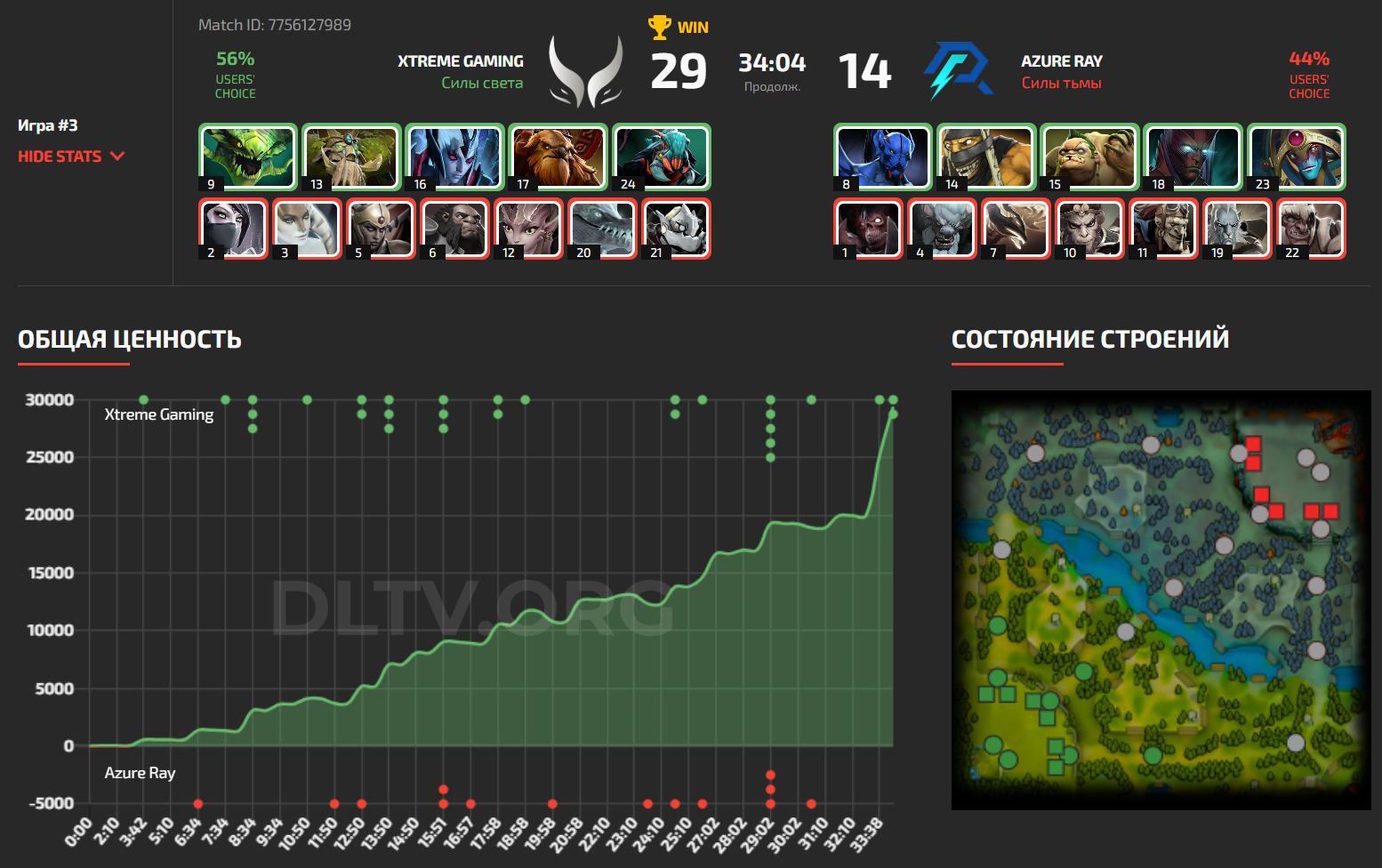 Первая карта получилась пассивной, герои в драфтах обеих команд имели огромное количество ХП и не имели берст-урона. Xtreme Gaming лучше качали карту и чаще совершали хорошие пик-оффы, за счет чего к 37 минуте набрали 23 тысячи преимущества, однако в лейте оказалось, что у них недостаточно урона и Azure Ray полностью отыграли преимущество за одну драку.