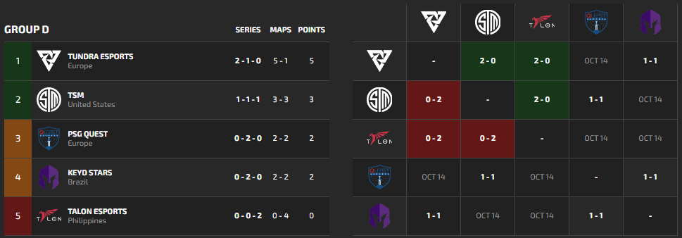 The most shocking result is Talon, who went winless today and has a score of 0-4. They are on the verge of elimination unless they can fix their problems for tomorrow.