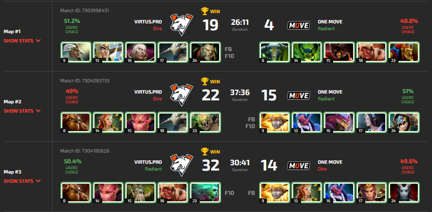 VP showed they were superior, giving their opponents no chance to win. The first game was a total stomp, as Virtus.Pro only took 26 minutes to force out the GG from One Move.